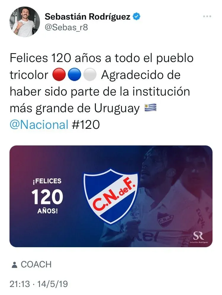 Los bolsos recordaron una publicación de Rodríguez del 14 de mayo de 2019, cuando saludó al club por sus 120 años de fundación.