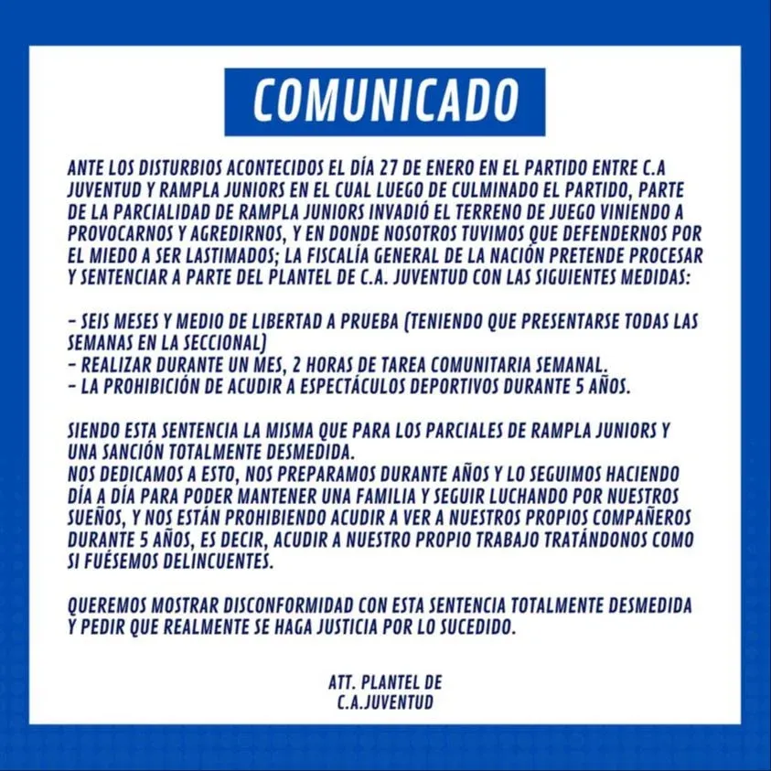 El mismo dice: "Ante los disturbios acontecidos el día 27 de enero en el partido entre Juventud y Rampla Juniors, en el cual, luego de terminado el partido, parte de la parcialidad de Rampla Juniors invadió el terreno de juego viniendo a provocarnos y agredirnos, y en donde nosotros tuvimos que defendernos por el miedo a ser lastimados; la Fiscalía General de la Nación pretende procesar y sentenciar a parte del plantel de Juventud con las siguientes medidas: - Seis meses y medio de libertad a prueba (teniendo que presentarse todas las semanas en la seccional). - Realizar durante un mes, 2 horas de tarea comunitaria semanal. la prohibición de acudir a espectáculos deportivos durante 5 años".