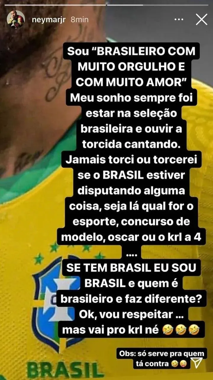 "Soy 'brasileño con mucho orgullo y con mucho amor'”, comenzó el mensaje de Instagram de Ney haciendo referencia a una canción que cantan los aficionados brasileños.