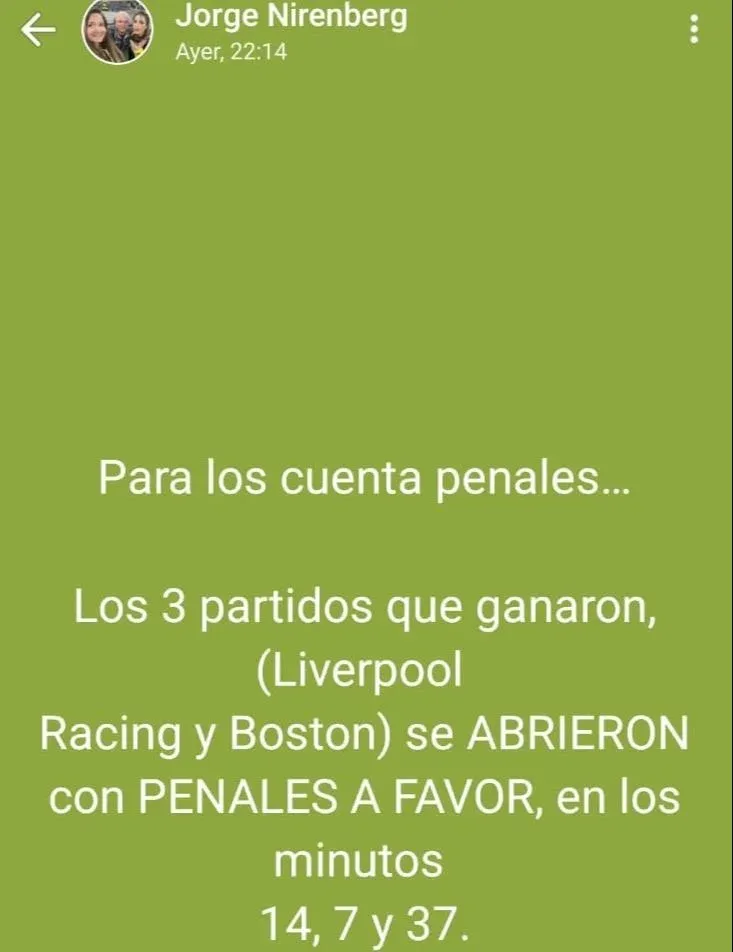 Uno de los comentarios de Jorge Nirenberg en contra del arbitraje del partido Nacional-Boston River Luego continuó: "Para los que cuentan penales... Los 3 partidos que ganaron (los tricolores) (Liverpool, Racing y Boston) se ABRIERON con PENALES A FAVOR en los minutos 14, 7 y 37".