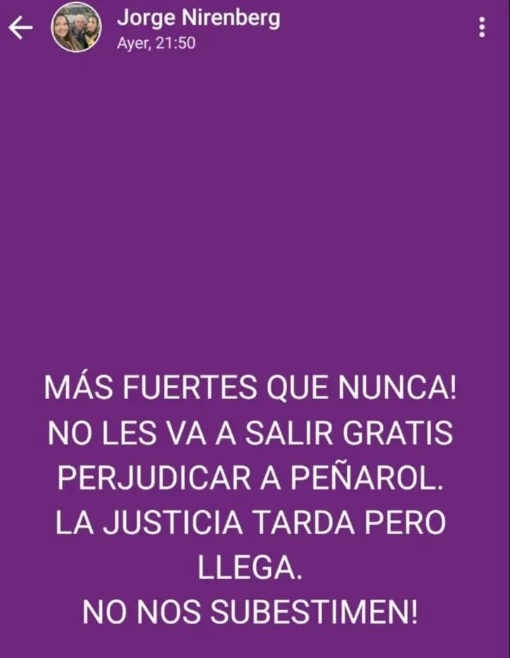 "No nos subestimen!!", escribió Jorge Nirenberg, el dirigente de Peñarol "Más fuertes que nunca! No les va a salir gratis perjudicar a Peñarol. La justicia tarda pero llega. No nos subestimen!".