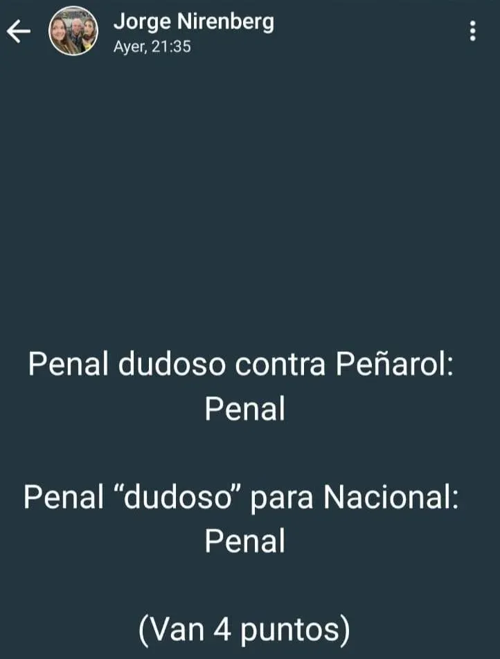 Jorge Nirenberg, dirigente de Peñarol, escribió sobre los penales que le dieron a Nacional en estas primeras fechas del Apertura Luego añadió: "Penal dudoso contra Peñarol: penal; penal 'dudoso' para Nacional: penal. (Van 4 puntos)".