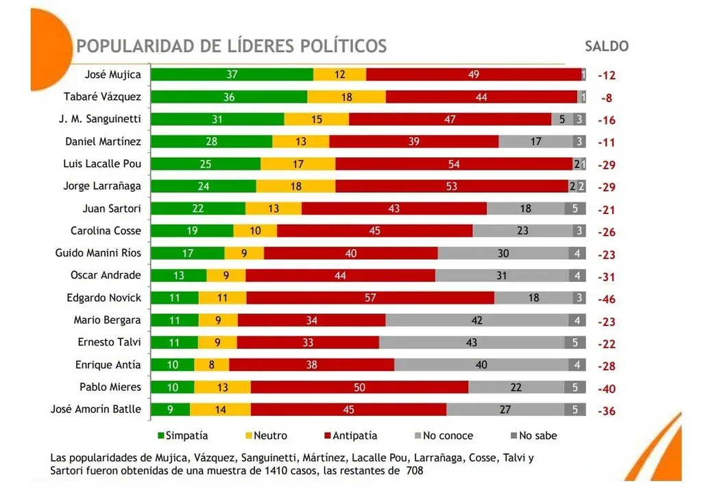 ● Aunque cayó cuatro puntos, Sanguinetti es el líder opositor con mejor índice de simpatía (31%). Su saldo empeoró (de -8 a -16) porque también creció la antipatía.