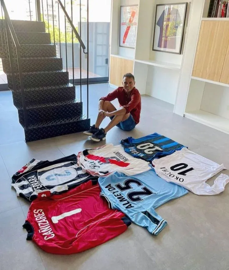 "Acá con algunas de las camisetas que guardo en el museo de casa en Argentina", escribió en Instagram el exfutbolista argentino Javier Saviola.