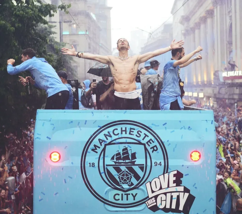 Durante la caravana en las calles de Manchester el delantero acaparó los titulares mientras posaba sin camisa y bebía champán.
