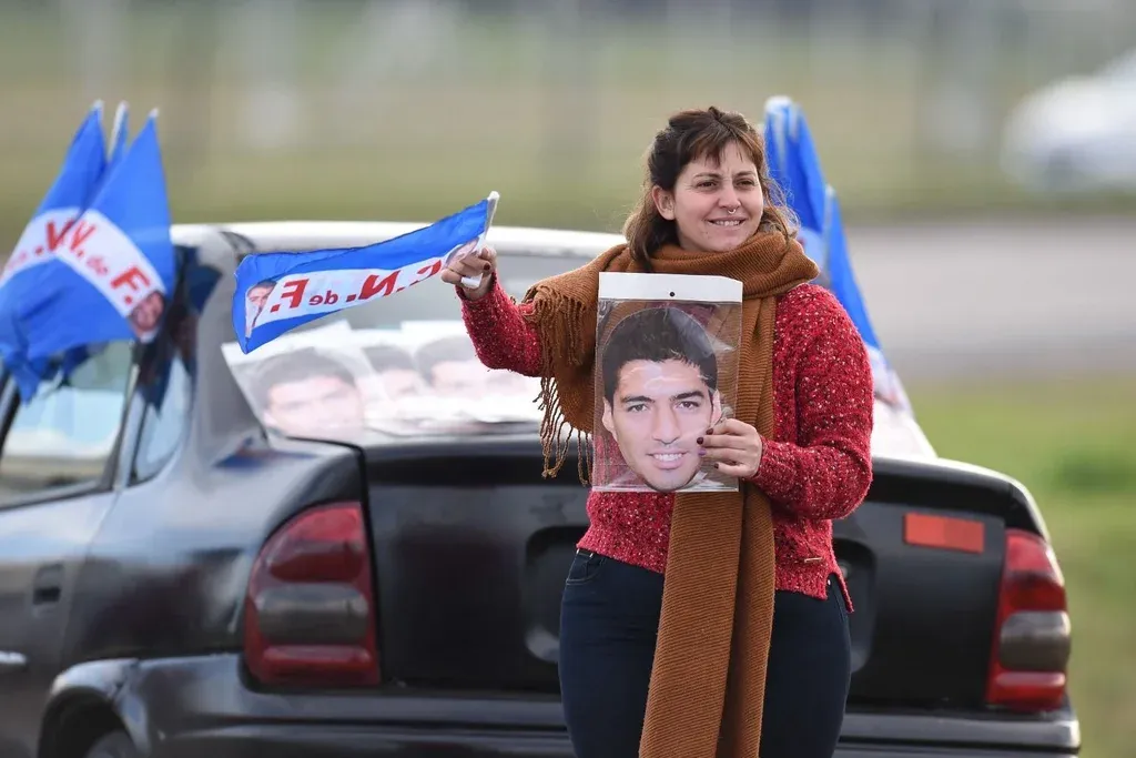 La caravana prevista para acompañar a Luis Suárez a lo largo del trayecto desde el aeropuerto de Carrasco, al que arribó a la hora 10.55 de este domingo para jugar en Nacional, comenzó a tomar color incluso antes de que el salteño arribara a Montevideo.
