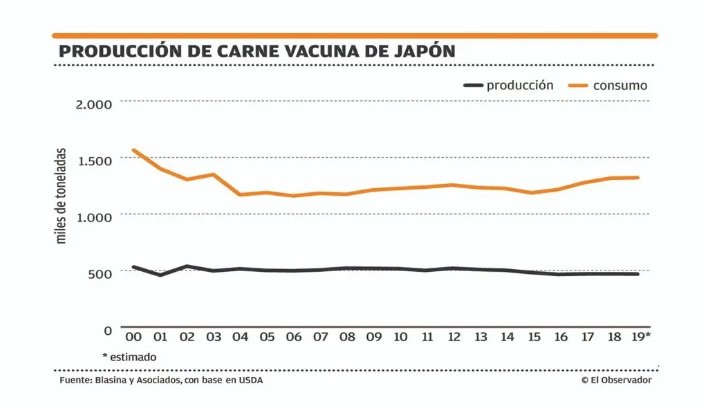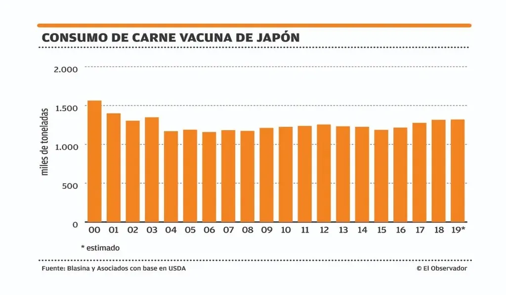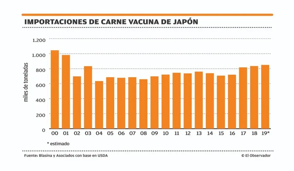 La oficina del USDA en Tokio proyecta que las importaciones de carne vacuna de Japón aumenten de 835.000 toneladas en 2018 a 850.000 en 2019, consolidándose como el segundo mayor importador de carne vacuna del mundo después de China (1,32 millones de toneladas).