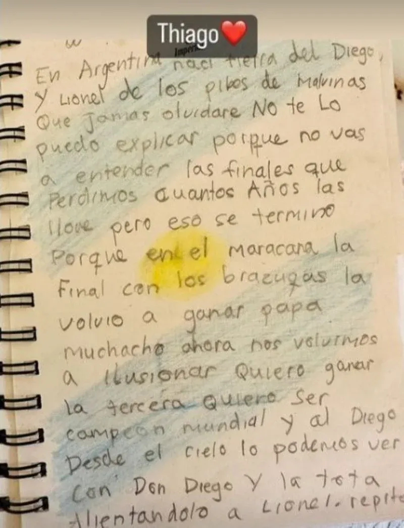 La carta termina: "Quiero ganar la tercera, quiero ser campeón mundial... Y al Diego, desde el cielo lo podemos ver, con Don Diego y con la Tota, alentándolo a Lionel...".