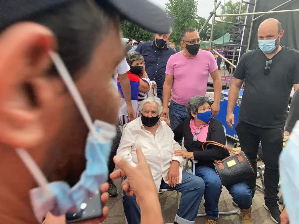 "¡Pedro!", llamaban a gritos los militantes, que les hacía falta uno más para cerrar la cadena humana en torno a Mujica. El expresidente se instaló con su silla playera detrás del escenario rosado en la avenida central de Centenario, y no se movió hasta que le tocó hablar al cierre. Los militantes pedían calma a los simpatizantes y dejaban pasar "de a uno" para que todos se fueran con su foto. También exigían tapabocas. El exmandatario nunca dejó de estar rodeado.