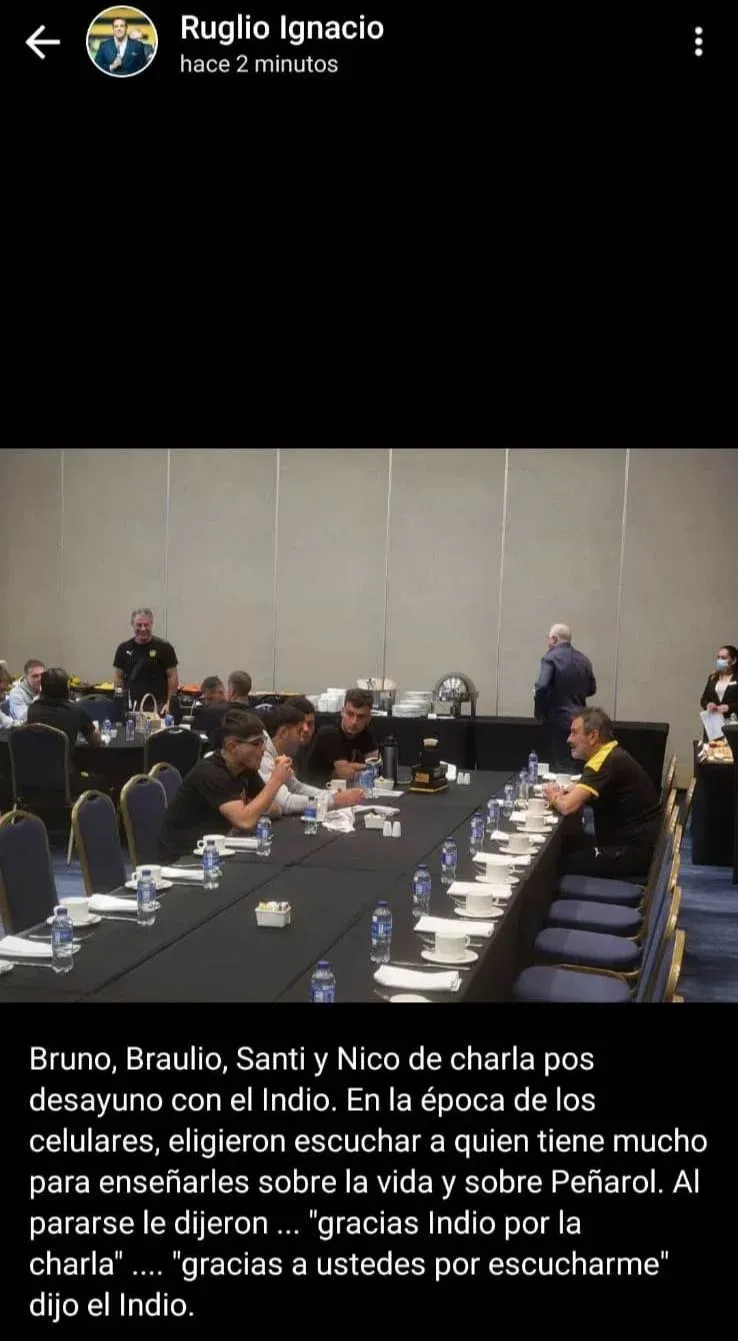 "Bruno, Braulio, Santi y Nico de charla post desayuno con el Indio. En la época de los celulares, eligieron escuchar a quien tiene mucho para enseñarles sobre la vida y sobre Peñarol. Al pararse le dijeron: 'Gracias Indio por la charla'. 'Gracias a ustedes por escucharme', dijo el Indio", escribió Ruglio.