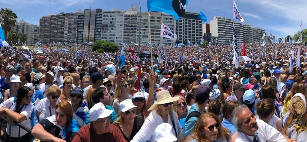 Los militantes llenan la explanada de Kibón con banderas de los partidos integrantes de la coalición a la espera de la presentación de la fórmula presidencial. El presidente electo, Luis Lacalle Pou, ya llegó y se espera que se de comienzo a la celebración en minutos.