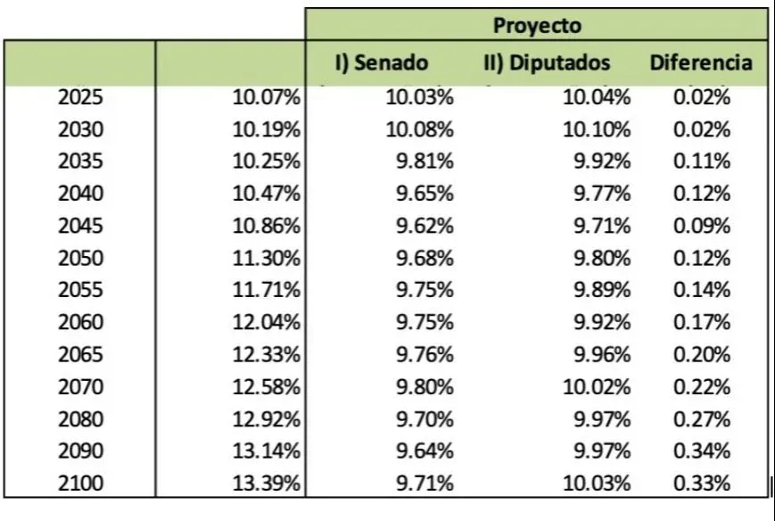 La diferencia máxima se observa en 2100, año para el que sin modificaciones el Estado debería destinar 13,39% de su PBI mientras que ahora será 10,03% (con el texto del Senado eran 9,71%). Es decir, las modificaciones realizadas entre una cámara y otra significarán un gasto 0,33% mayor para ese momento y el “efecto reforma” se traducirá en 3,36% menos de erogaciones.