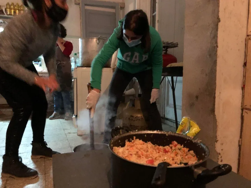 Ester esperaba en la ventana de una casa antigua de Palermo su plato de comida. Tatiana Fernández, con guantes y tapaboca, le alcanzó primero un recipiente con yerba y luego un táper con el menú del día, que adentro preparaban seis voluntarios: cuscús de vegetales con cerdo agridulce. A sus 50 y pico de años –prefirió no decir cincuenta y cuántos–, esta era una de las primeras veces de la mujer en una olla popular.