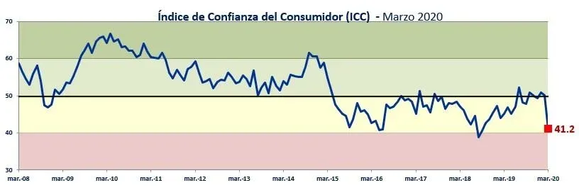 Como era de esperar, el Índice de Confianza del Consumidor (ICC) registró en el mes de marzo un descenso de 9 puntos respecto a febrero. Este cambio representa la mayor contracción mensual del índice desde que se mide (el mayor descenso se había registrado en agosto de 2013, -6,2 puntos).