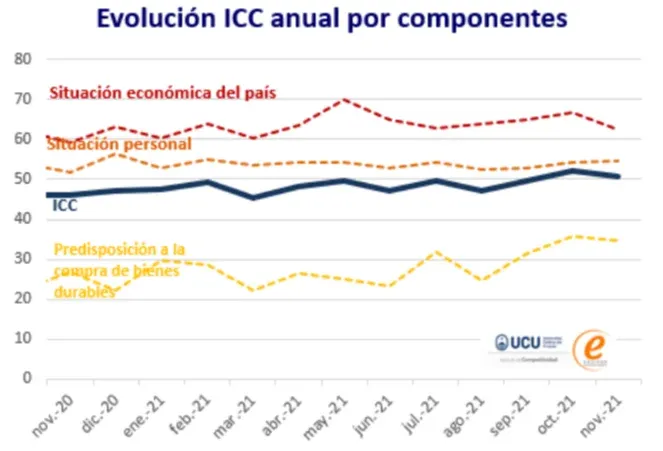 "Por lo tanto, como viene sucediendo desde marzo de este año, la confianza del consumidor es mayor en 2021 respecto a la misma fecha del año anterior. La desmejora registrada en el ICC este mes modera la suba del mes anterior donde el índice obtenía el mayor puntaje registrado desde marzo 2015. Este descenso, corresponde a una desmejora en dos de los tres subíndices que lo componen, aunque de distinta magnitud", explicó el informe elaborado por la Cátedra de Confianza Económica de la UCU y Equipos. El ICC registró un descenso en dos de tres índices; mostró una mejoría en la Situación económica personal y un retroceso en la Situación económica del país y la Predisposición a la compra de bienes durables.