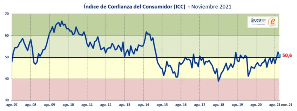 El Índice de Confianza del Consumidor (ICC) retrocedió 1,7 puntos en noviembre y quedó con un puntaje de 50,6, moderando la suba del mes anterior y se mantuvo en el límite dentro de la zona de moderado optimismo (por encima de 50 puntos). Se trata del segundo mes consecutivo dentro de esta zona, un nivel que el ICC no había vuelto a alcanzar desde la aparición del coronavirus en el país (marzo 2020)