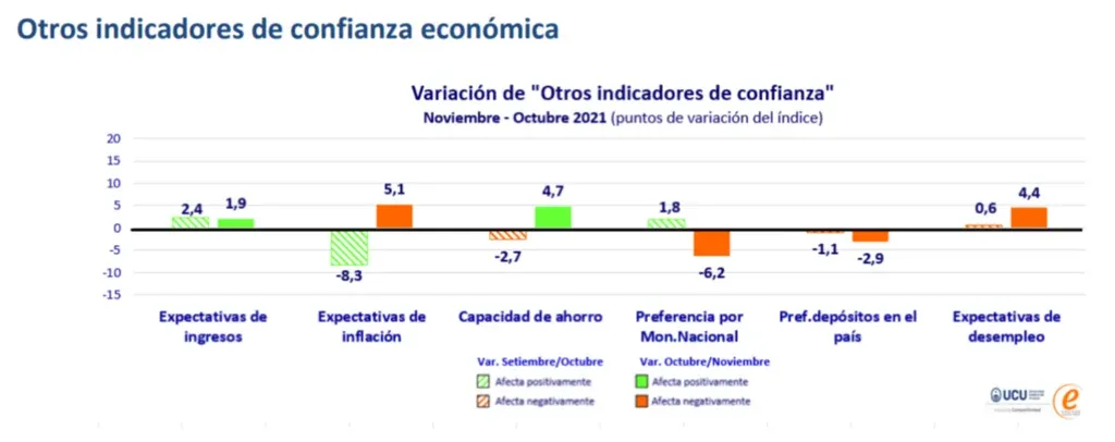 Por otra parte, la Situación económica del país cortó la racha de tres meses al alza y bajó a 62,5. Sus dos componentes (situación económica del país a uno y tres años) empeoraron con respecto al mes anterior. El informe planteó que ello "podría ser un reflejo de la nueva variable de covid-19 detectada, a partir de la cuál muchos países están volviendo a tomar medidas restrictivas pudiendo tener un impacto en la economía de Uruguay". Además agregó que "las últimas medidas económicas de Argentina relacionadas con las compras de pasajes y compras en el exterior también podrían haber tenido un impacto en la percepción de la situación económica del país de cara a una nueva temporada de verano".