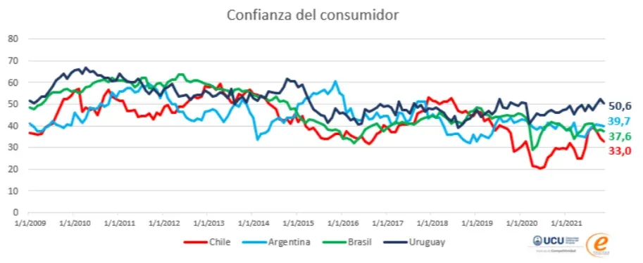 Uruguay, por último, es el país con mayor pérdida de confianza (-1,7 puntos) pero aún continúa dentro de la zona optimista del gráfico (más de 50 puntos), aunque se acerca a la neutralidad (50 puntos).