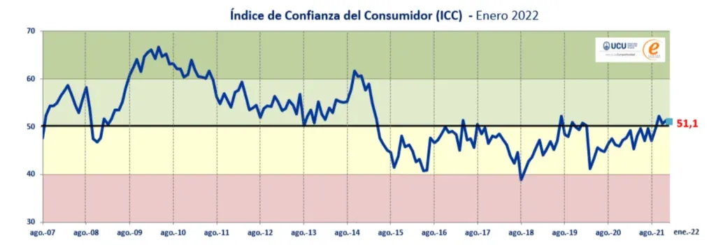 El Índice de Confianza del Consumidor (ICC) retrocedió 0,3 puntos en enero. Quedó con un puntaje de 51,1 y se mantuvo en el límite dentro de la zona de moderado optimismo (por encima de 50 puntos), donde se ubica desde octubre del año pasado. Comparado con el mismo mes de 2021, el índice fue 3,5 puntos mayor.