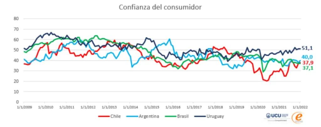Al tiempo que el país está en la zona de moderado optimismo (entre 50 y 60 puntos), Argentina se ubica en el límite entre el moderado pesimismo (entre 40 y 50 puntos) y el atendible pesimismo (menos de 40 puntos) y Brasil y Chile continúan posicionados en el nivel de atendible pesimismo (menos de 40 puntos), detalló el documento.