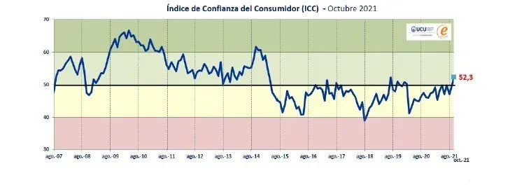En relación a octubre de 2020, el Índice de Confianza del Consumidor (ICC) es 6,1 puntos mayor; y, si se consideran los promedios acumulados (ene-20/oct-20) y (ene21/oct-21), el índice es 2,5 puntos mayor. Por lo tanto, como viene sucediendo desde marzo de este año, la confianza del consumidor es mayor en 2021 respecto a la misma fecha del año anterior, explica el informe elaborado por la Universidad Católica y Equipos Consultores divulgado este jueves.