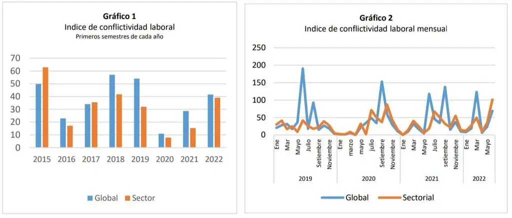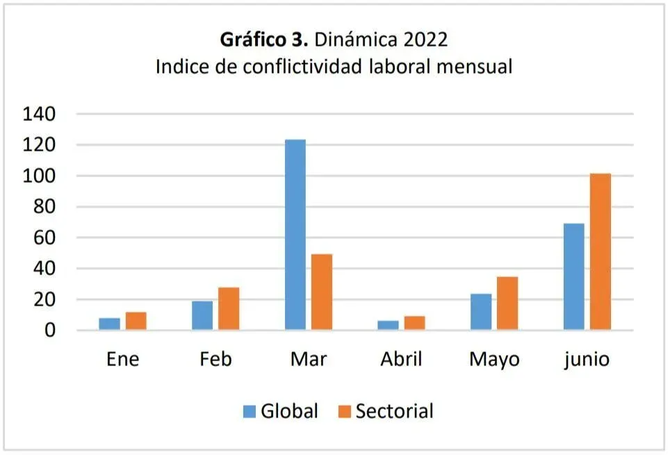 Según el informe de la UCU, en 2022 se observan dos momentos que destacan: marzo con un aumento importante de la conflictividad global debido al paro general y junio con un importante aumento de la conflictividad sectorial. En el mes de junio hubo 13 conflictos con paros, incluso más de un paro en alguno de ellos, como en el caso de la industria láctea o la banca.
