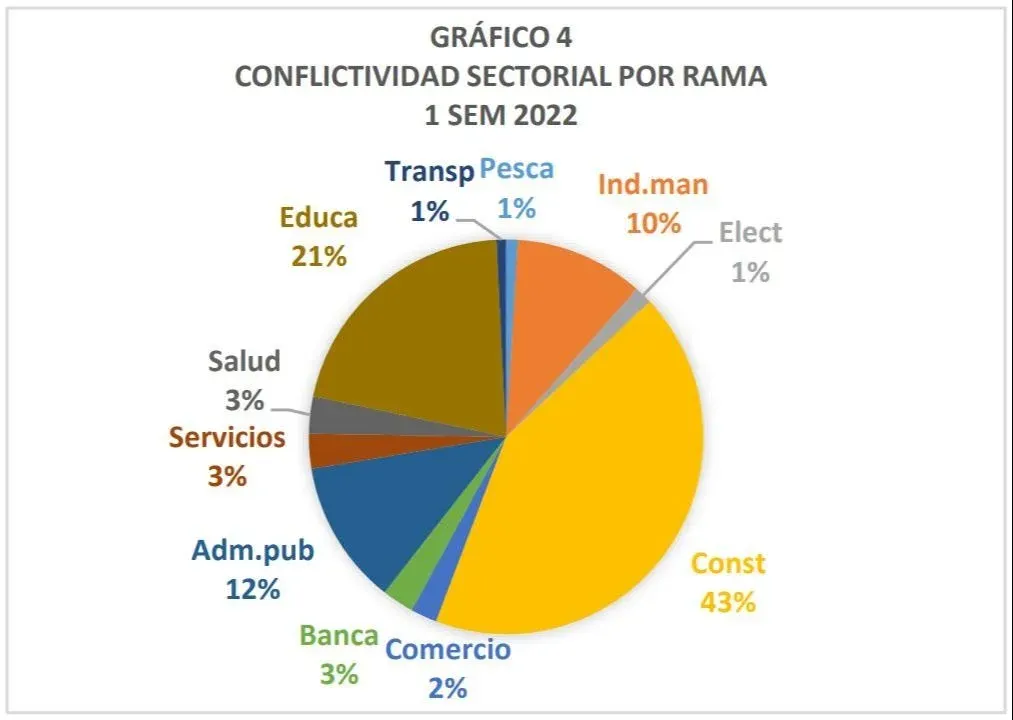 La construcción fue la rama que presentó la mayor conflictividad sectorial -sin considerar el paro general- y representó el 43% de la misma. Al paro de toda la rama realizado en junio, se sumaron en el semestre cuatro paros por fallecimientos en accidentes de trabajo.