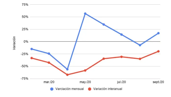 Sin embargo, en la perspectiva mensual hubo un aumento en todas las categorías, pero se destaca particularmente turismo, con 46%, seguido de construcción (30%) e industria (25%).