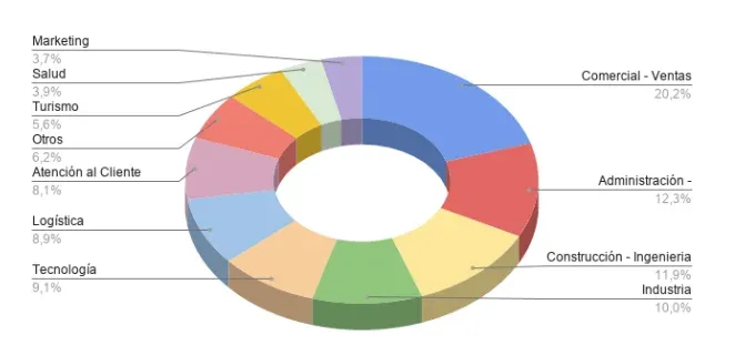 Turismo es el área que presentó una mayor contracción y tuvo una reducción de 41% de las oportunidades laborales. Lo sigue administración y finanzas con una caída de 31% y marketing con una reducción de 26%.