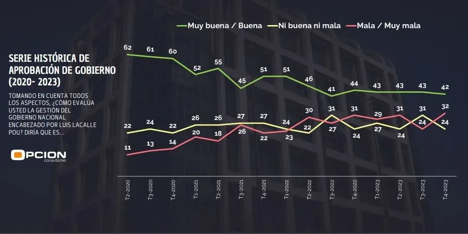 La desaprobación de la gestión del presidente Luis Lacalle Pou creció 8 puntos respecto a la última medición, mientras que la aprobación se mantuvo estable (pasó de 43% a 42%), según la última encuesta de la consultora Opción presentada este lunes en Telenoche (Canal 4).