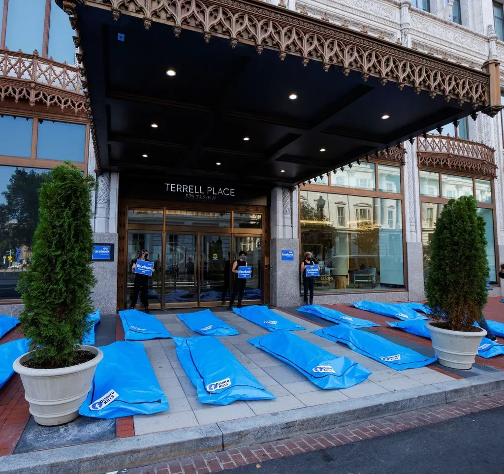 Asimismo, el grupo publicó fotos de las bolsas para cadáveres que eran del mismo color que el logo de Facebook y contaban con un cartel que incluía el logotipo de la empresa más la leyenda “la desinformación mata”.