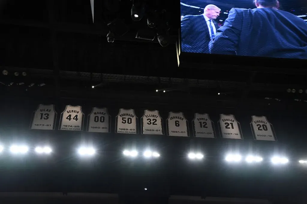 Depués llegaría el momento histórico de la ceremonia de la retirada del número 20, en la que se dio a conocer el mensaje de felicitación enviado por el presidente de Argentina, Mauricio Macri, y el nombre Ginóbili quedó inmortalizado junto al de Johnny Moore (00), Avery Johnson (6), Bruce Bowen (12), James Silas (13), Tim Duncan (21), Sean Elliott (32), George Gervin (44) y David Robinson (50).
