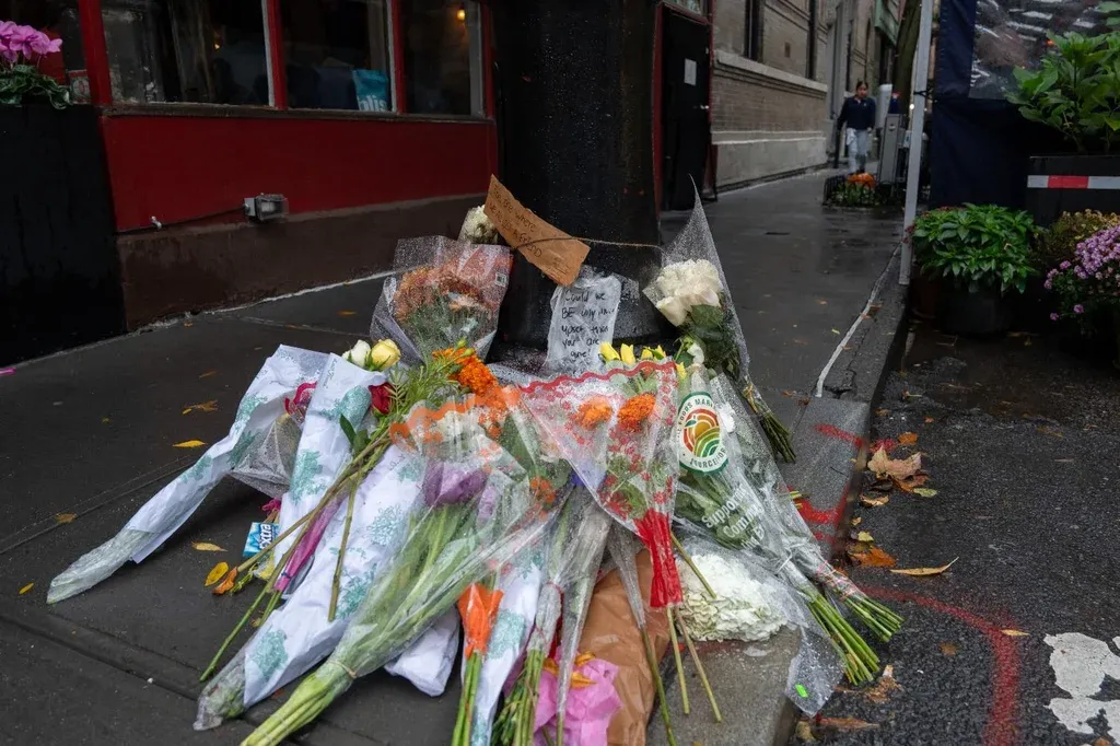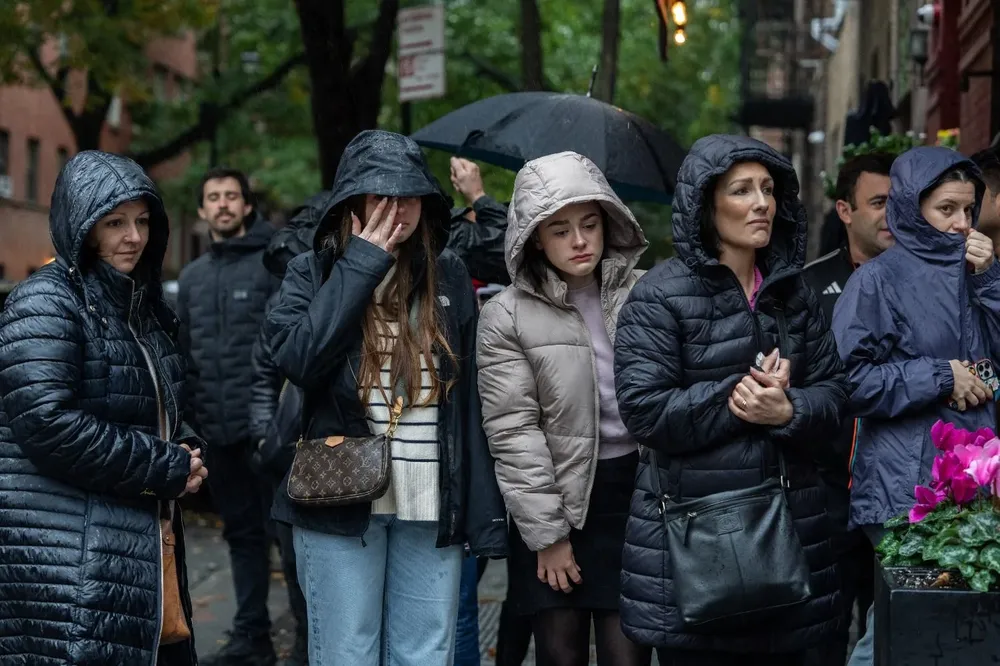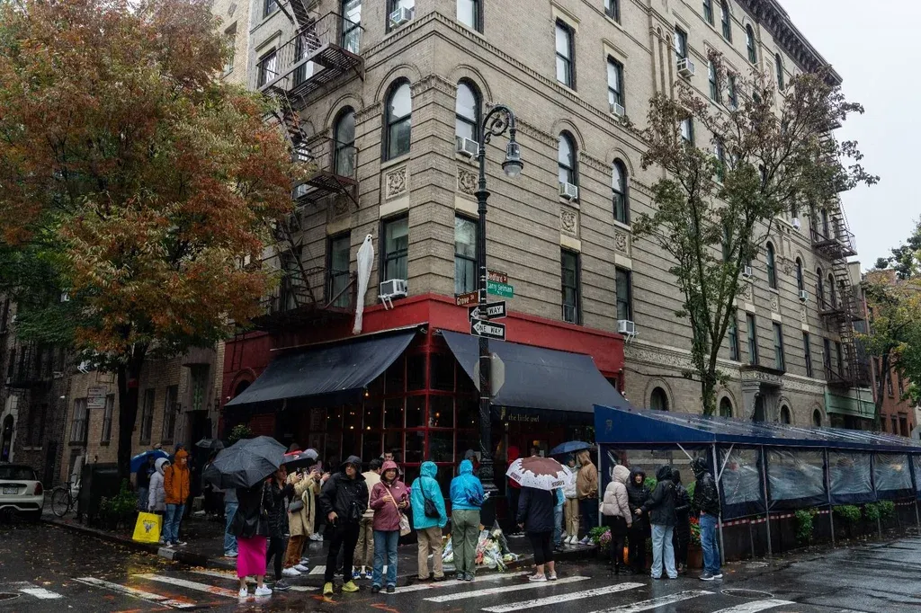 La llovizna no impidió que los visitantes presentaran sus respetos en la reconocible esquina del barrio de moda de West Village donde se asienta el edificio de seis plantas, adornado al estilo clásico neoyorquino con una fachada de ladrillo y escaleras de incendios metálicas.