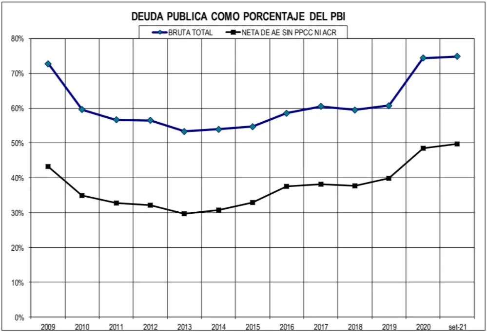 No obstante, "ese deterioro excepcional en la relación entre la deuda pública y el PIB siguió a uno también muy importante que se dio en los años anteriores, con bajas tasas de crecimiento económico y elevados desequilibrios fiscales", señaló el informe. "Después de que la deuda pública tocara mínimos con relación al PIB a finales del año 2013, se dio una seguidilla de seis años con aumentos en esa relación. En el caso de la deuda bruta, se pasó del 53,3% al ya referido 60,8% del producto al cabo de 2019, y en el caso de la deuda neta, se pasó del 29,6% al 39,9% del PIB entre 2013 y 2019", detalló el documento.