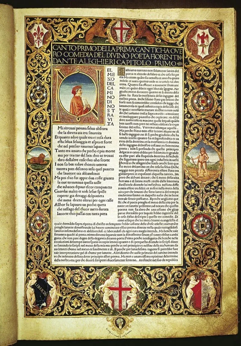 El infierno de la Divina Comedia, primera página iluminada, edición anotada por Cristoforo Landino, 1481. Florencia, Biblioteca Nazionale Centrale