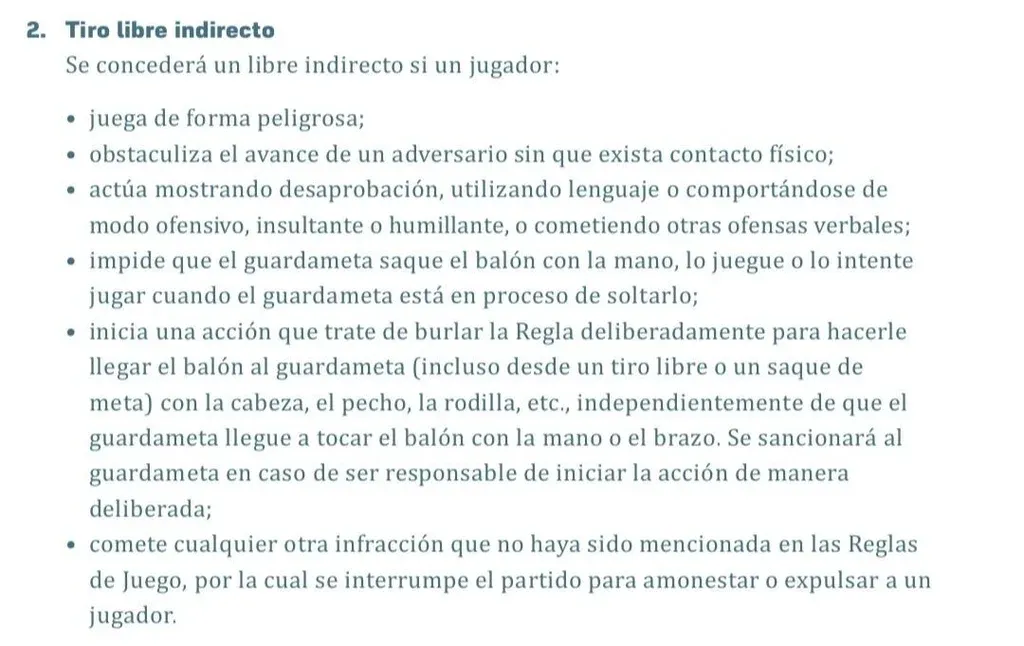 Para estas situaciones el reglamento señala que se cobrará tiro libre indirecto si algún jugador “inicia una acción que trate de burlar la Regla deliberadamente para hacerle llegar el balón al guardameta (incluso desde un tiro libre o un saque de meta) con la cabeza, el pecho, la rodilla, etc., independientemente de que el guardameta llegue a tocar el balón con la mano o el brazo”.