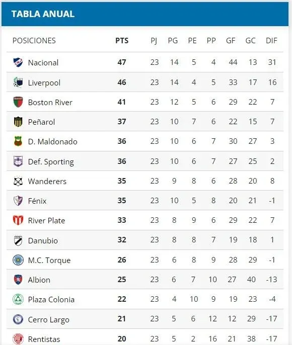 Tabla Anual del Campeonato Uruguayo en agosto 2022