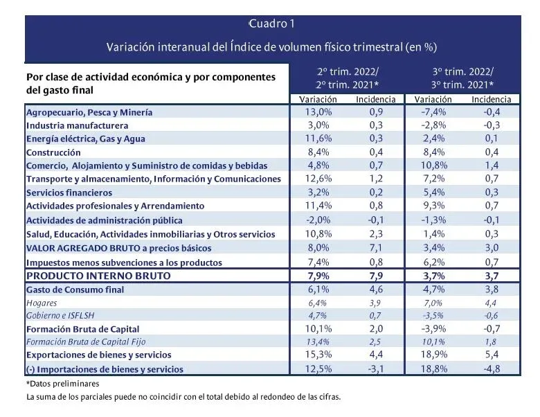 Asimismo indicó que en el cuarto trimestre se sumará la caída en las exportaciones que se observa desde setiembre. De Haedo destacó que el crecimiento "propio" de 2022, al cabo de los primeros tres trimestres es de 2,1%.
