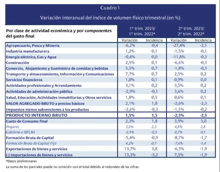 El Producto Interno Bruto (PIB) cayó 1,4% respecto al trimestre inmediato anterior (enero-marzo), es decir en términos desestacionalizados. En tanto, en la medición interanual, la actividad económica descendió 2,5% respecto al período abril-junio del año pasado.