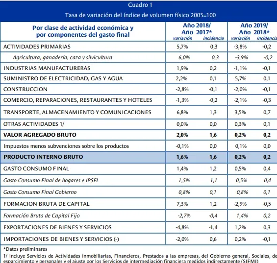 De acuerdo al comunicado del BCU, desde el enfoque de la producción, se destacan los desempeños positivos en los sectores transporte, almacenamiento y comunicaciones (+3,5% respecto a 2018), como resultado del crecimiento en las telecomunicaciones y de suministro de electricidad, gas y agua, explicado por la mayor generación de energía eléctrica para exportación. Estos aumentos fueron parcialmente contrarrestados por las caídas en comercio, reparaciones, restaurantes y hoteles (-2,1%), y de las actividades primarias (-3,8%). En el primer caso, se destaca principalmente la caída en la comercialización de bienes nacionales, y en menor medida de bienes importados, así como la caída de los servicios de restaurantes y hoteles por la menor demanda de turistas. En actividades primarias, el desempeño negativo del sector se explica por la disminución en la faena en frigoríficos y de las exportaciones de ganado en pie.
