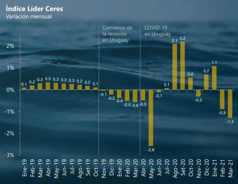 Tras ocho meses seguidos de recesión (noviembre 2019 a junio 2020), el índice Líder había logrado cuatro meses positivos (julio a octubre), pero luego dio negativo en noviembre, positivo en diciembre y enero, y nuevamente negativo en febrero y marzo.