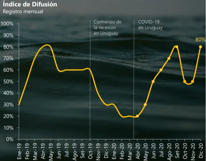 Por otro lado, el Índice de Difusión de Ceres de diciembre fue 80%, lo que indica que la mayoría de las variables que componen el ILC se comportaron de manera expansiva. Este indicador había sido 60% en julio, 70% en agosto, 80% en setiembre, 50% en octubre y en noviembre, por lo que el registro de diciembre es alentador para la continuidad de tasas positivas.
