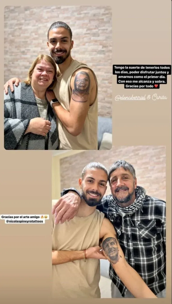 Nicolás Piñeyro Los tatuajes de los padres de Thiago Vecino realizados por el tatuador Nicolás Piñeyro “Tengo la suerte de tenerlos todos los días, poder disfrutar juntos y amarnos como el primer día. Con eso me alcanza y sobra. Gracias por todo”, escribió Thiago.