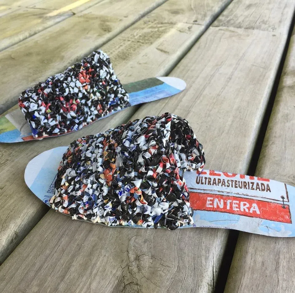 Bajo el nombre de La Sachetera de Montevideo, Schimchak confecciona capas para la lluvia, bolsos, sobres, sandalias, baberos, juegos y tejidos utilizando, únicamente, sachets de leche y yogurt, una tijera y una selladora de calor.