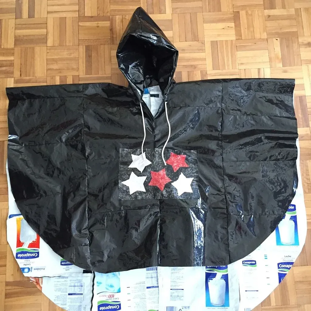 La materia prima son sachets de leche y yogur con el interior negro. Esto se debe a que la calidad de ese plástico, por su grosor, es mejor que el de los de leche fresca. "Primero se sellan los sachets, se hace una lona y de ahí se confeccionan los productos" contó Schimchak. Para crear una capa de lluvia son necesarios 40 sachets.