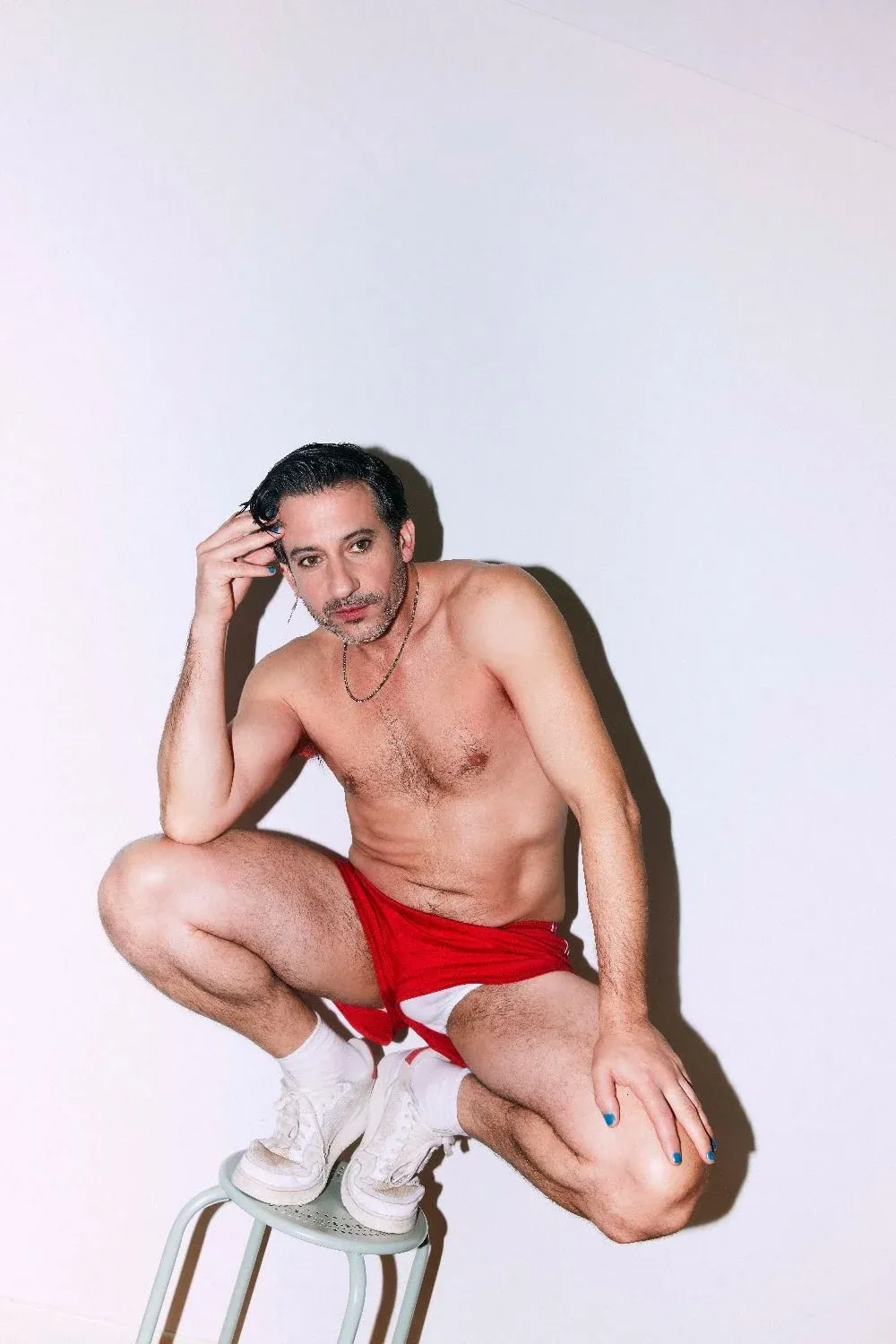 El escenario es una cruz inmensa que se introduce en la platea y escupe luces hacia arriba. Detrás de unos escalones iluminados aparece él: un cuerpo imponente, en el que cada músculo tiene algo que decir, un cuerpo en el que el short rojo con líneas blancas se reduce y donde dos uñas pintadas de turquesa, otra cruz colgada del lóbulo derecho, algo de rubor en los pómulos y la tintura roja de las axilas enmarca el relato. El del cuerpo más bonito que se habrá encontrado nunca en este lugar.