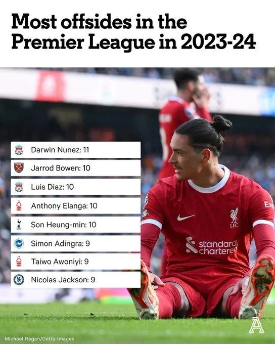 De acuerdo a las estadísticas de la web oficial de la Premier League, el delantero uruguayo lidera la tabla de jugadores con más off-sides en la temporada.