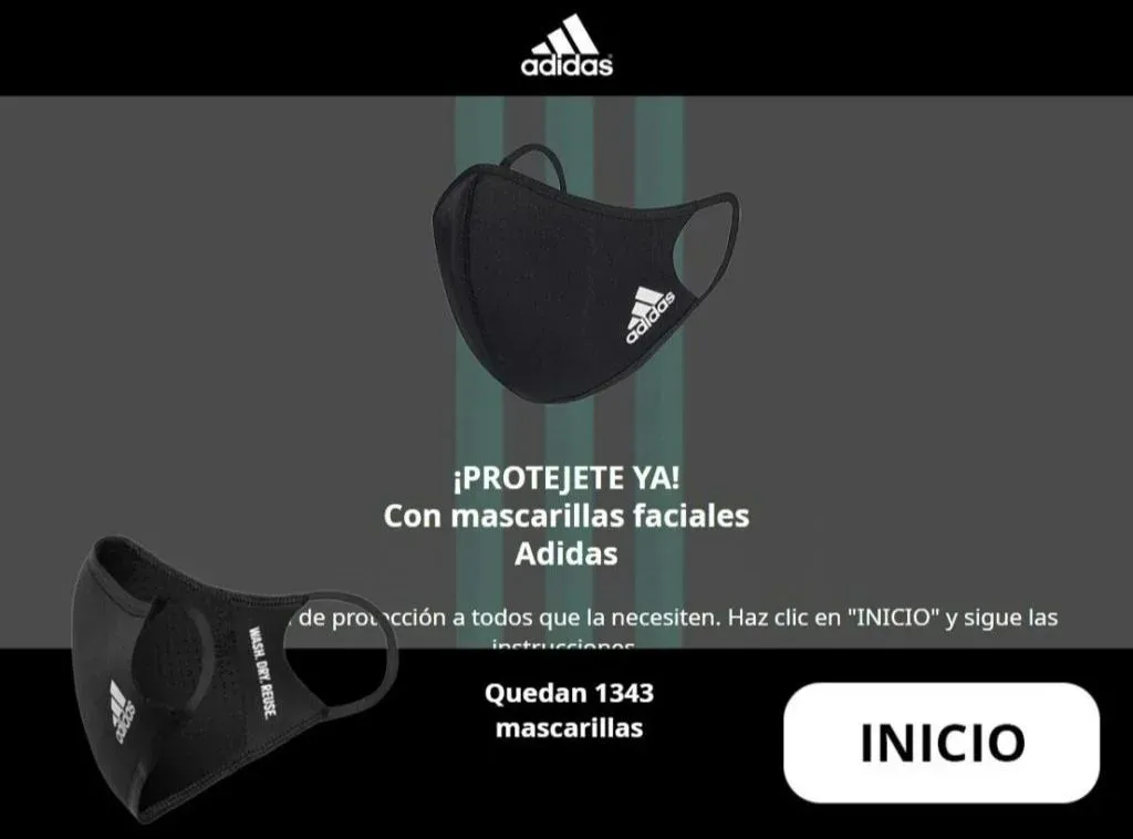 Los ciberdelincuentes utilizaron la imagen de la marca y pedían a los usuarios que llenen una encuesta bajo la supuesta recompensa de que recibirían mascarillas con el logo de Adidas.
