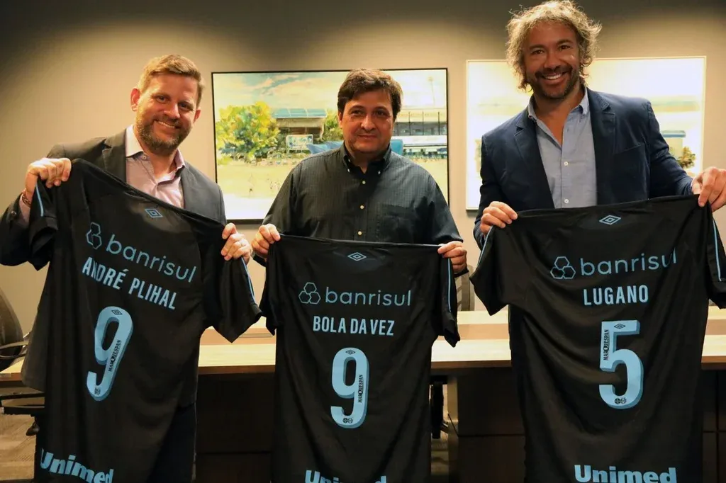 Gremio aprovechó la ocasión para recibir a los participantes de la nota, los periodistas André Plihal y Gustavo Berton, además de Lugano, entregándoles como regalo la nueva tercera camiseta oficial del club, la cual fue presentada este miércoles, como informó Referí.