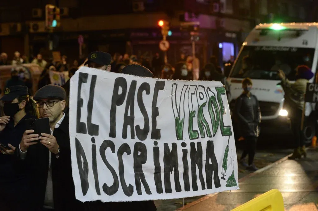 Con un megáfono en mano el abogado Gustavo Salle lideraba la protesta, que también llevaba consignas antivacunas, y aseguraba a los efectivos que no habría "actos de violencia" contra la policía.